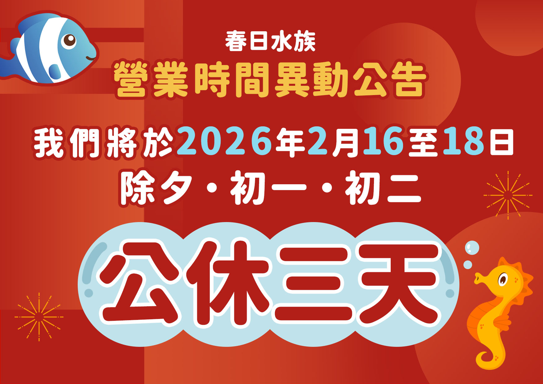 過年期間營業時間異動 SuperAqua 2026-01-05 【過年期間營業時間異動公告】 我們將於2026年2月16日(一)至2月18日(三) 年假期間 除夕、初一、初二 公休三天 其餘時間皆為正常營業 ( 營業時間 12:00 – 20:30 ) 預祝各位魚友們 馬年行大運 駿馬迎新春